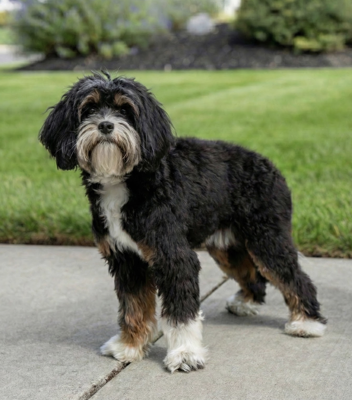 Een Munchkin Bernedoodle is een kleinere variant binnen het Bernedoodle spectrum, gericht op een compact formaat zonder in te leveren op stabiliteit en ras-eigenschappen. Met een gewicht van circa 10 lbs valt Kevin binnen het zeer kleine segment, geschikt voor huishoudens die een minimalistisch formaat zoeken met behoud van karakter.