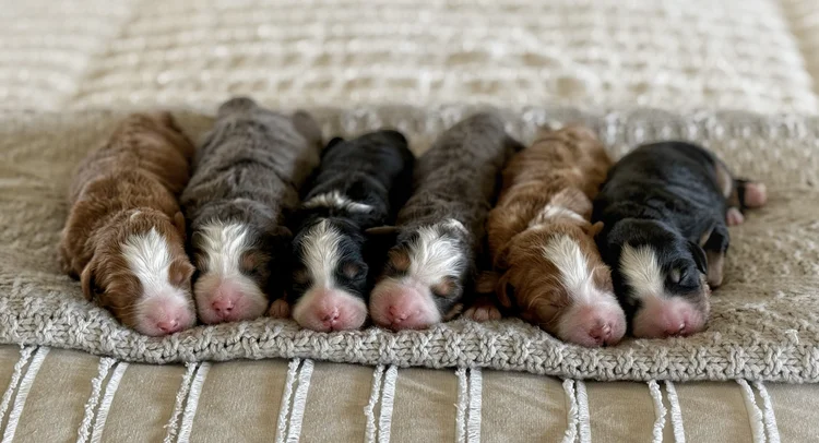 Het nest van Suki & Malcolm bestaat uit Mini/Tiny Ultra Bernedoodle pups, geboren op 31 januari 2026 en beschikbaar om mee naar huis te gaan vanaf 28/02/2026 in Nederland. Dit zorgvuldig geplande nest combineert compacte formaten met verhoogde Bernese-invloed en multigenerationele stabiliteit.